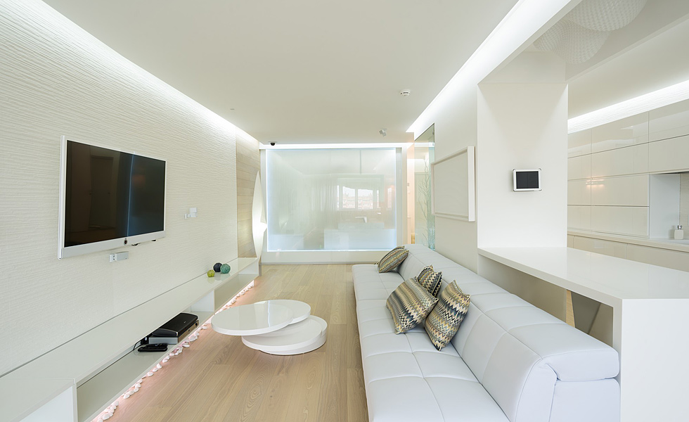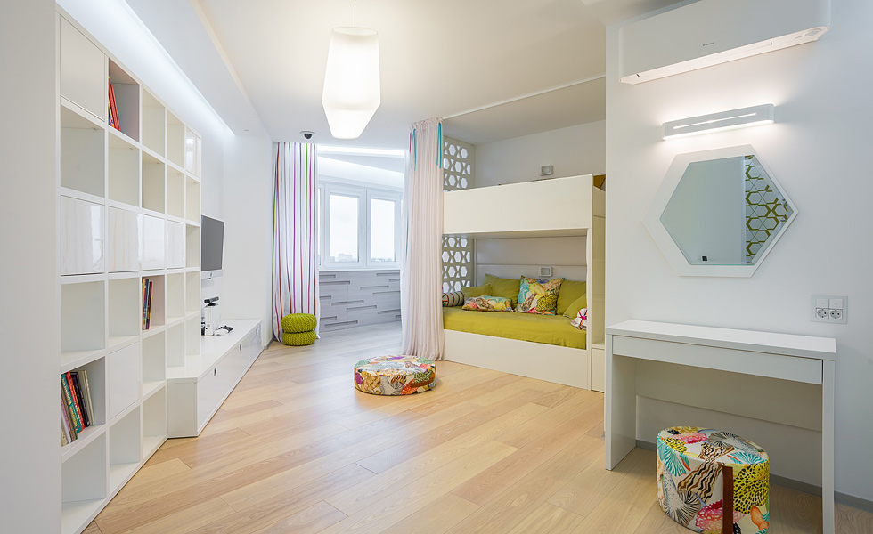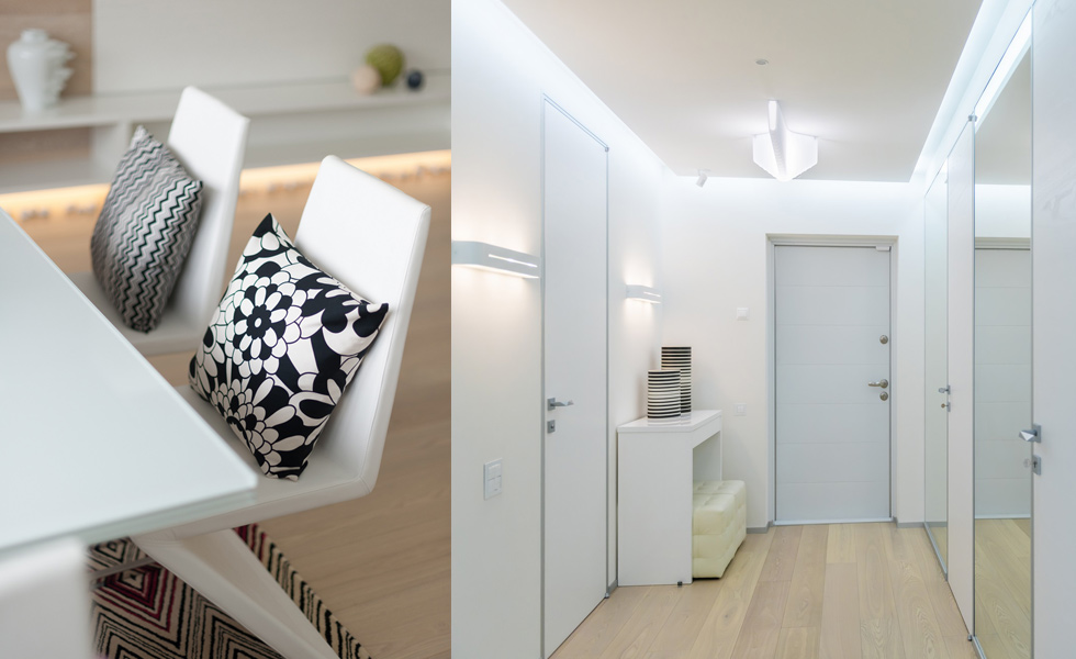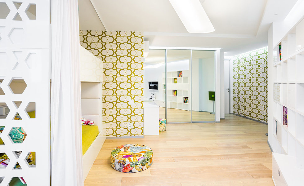 Белоснежная композиция снова нас удивляет, когда мы входим в зону отдыха. Двери спальни, а также двери из детской комнаты похожи на скрытые проходы, которые ведут нас в секретные комнаты.