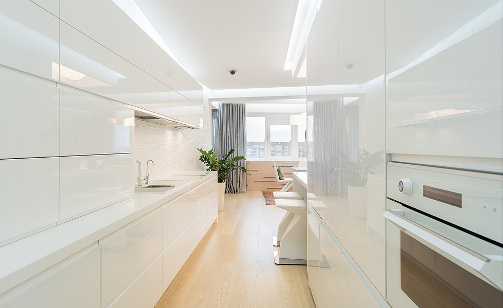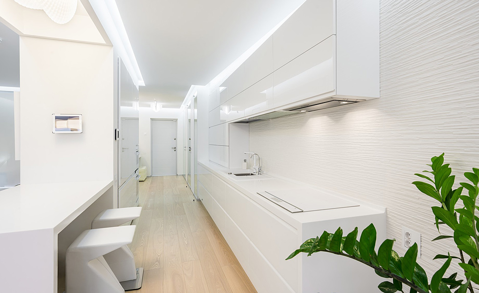 Когда вы впервые смотрите на фотографии с интерьером этой квартиры, очень трудно оценить, какова была бы его первоначальная поверхность. Белые стены, мебель и белые огни, волшебный эффект зеркал и глянцевые глазурованные поверхности обманывают вас миллионами отражений, и вы даже не можете поверить, что находитесь в небольшой квартире. Освещение, рядом с белым цветом трансформировался и увеличивал пространство вне пределов.