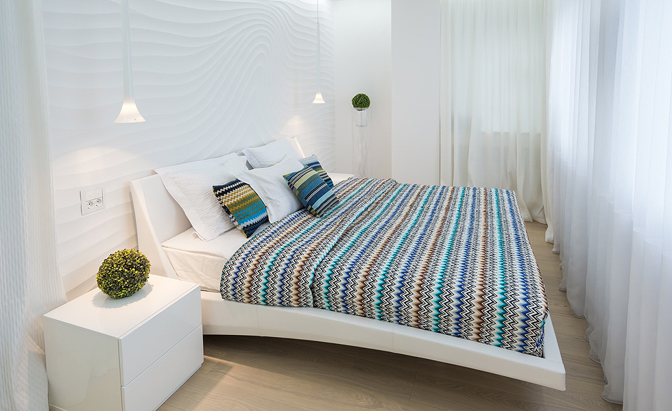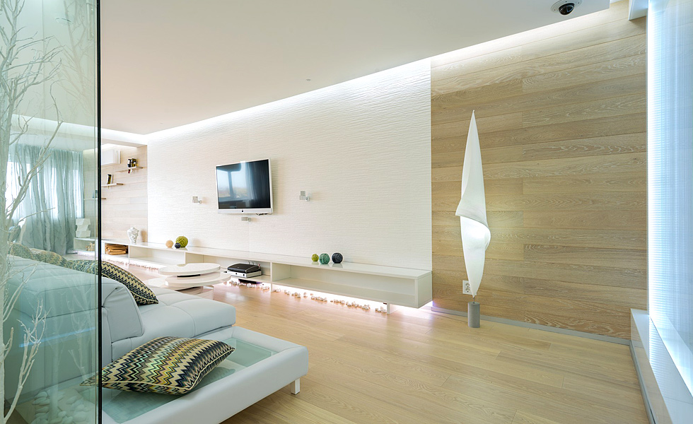 Проект WHITE & WHITE разработан дизайнером Анной Шемуратовой. Избыток белого и экологические материалы, такие как: деревянный пол, коррелированный со стенами и камнем. Источники света, благодаря своей органической форме, являются теплым присутствием в общей атмосфере комнаты. Интересный материал, керамический гранит, в естественном оттенке и рельефной текстуре, использовался для покрытия кухонных стен. Белые ветки деревьев, заключенные в куб стекла и металла в гостиной, каскаде и биокамине, холла, кухни, столовой и гостиной, являются открытой планировкой и представляют собой интересное открытое пространство. В этот интерьер отлично вписываются трековые светильники.