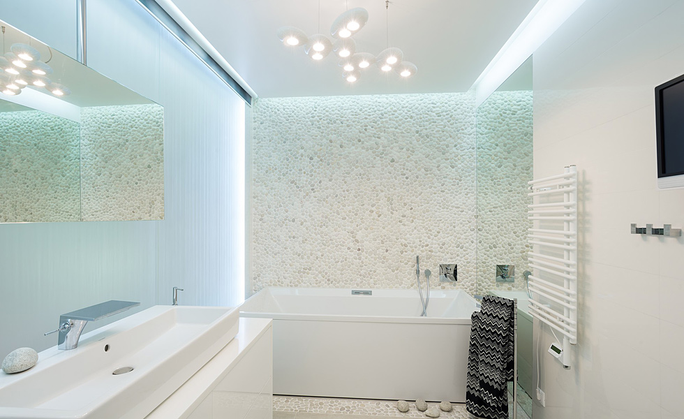 Натуральный камень, полупрозрачное стекло и проточная вода превращают небольшую ванну в настоящий спа-центр. Текстильные ткани по всей квартире, создают захватывающие акценты, которые привлекают внимание и восхищают глаз посетителя.