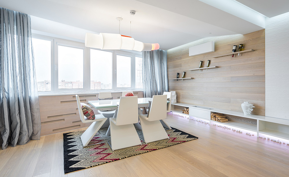 Еще раз убедилась в правильности выбора цвета стен дизайнером. У нас везде белые стены — они зрительно увеличили пространство. Такой интерьер выглядит торжественно и нарядно. Стена в гостиной у нас из паркетной доски под дуб. Получилось совсем не скучно, а нежно и никуда не хочется выходить из дома.