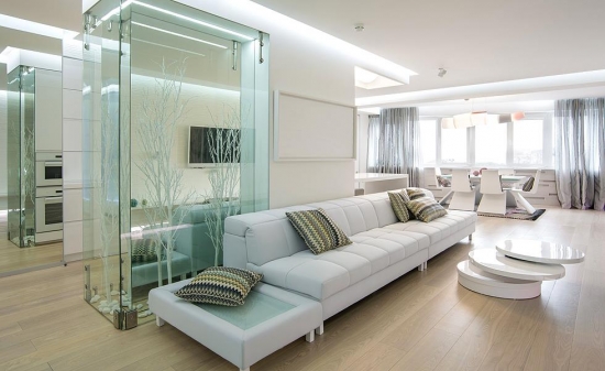 Белый цвет, стекло и зеркала — это действительно захватывающая идея для создания современной квартиры.