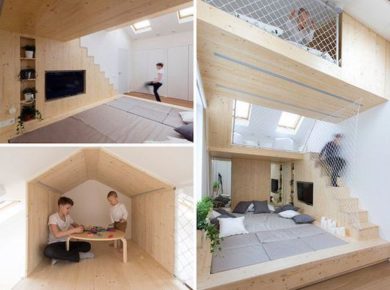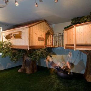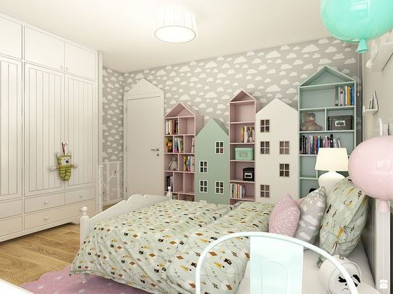 Обычно, детская комната маленькая в доме, поэтому нужно оставить максимум свободного места для игр. Хорошей идеей будет поставить кровать — диванчик, складываемый днем, или двухъярусная кровать.