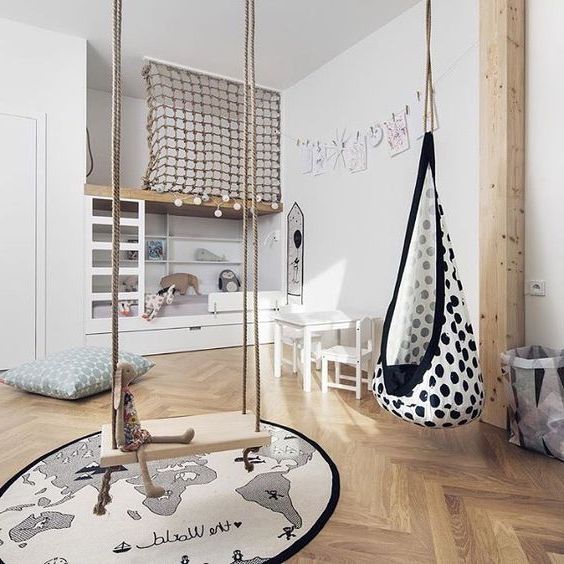 Самые смелые идеи напоследок! Мы мечтаем, чтобы маленькие гамаки стали частью детской комнаты. Ведь это собственная качели у себя в комнате! Если вы рискнете на такой эксперимент, очень внимательно просчитайте нагрузку на крепления для того, чтобы выбрать максимально безопасный.